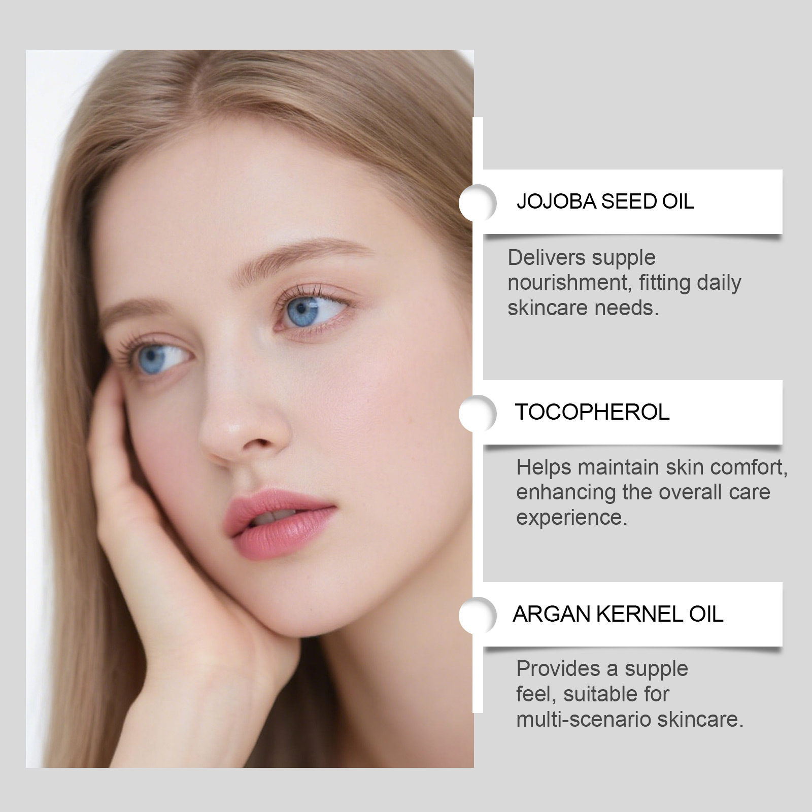 Ingredients: water, glycerin, 1,2- hexanediol, carbomer, arginine, jojoba seed oil, castor seed oil, rose hip oil, tocopherol (vitamin E), geranium oil and Aralia elata kernel oil.