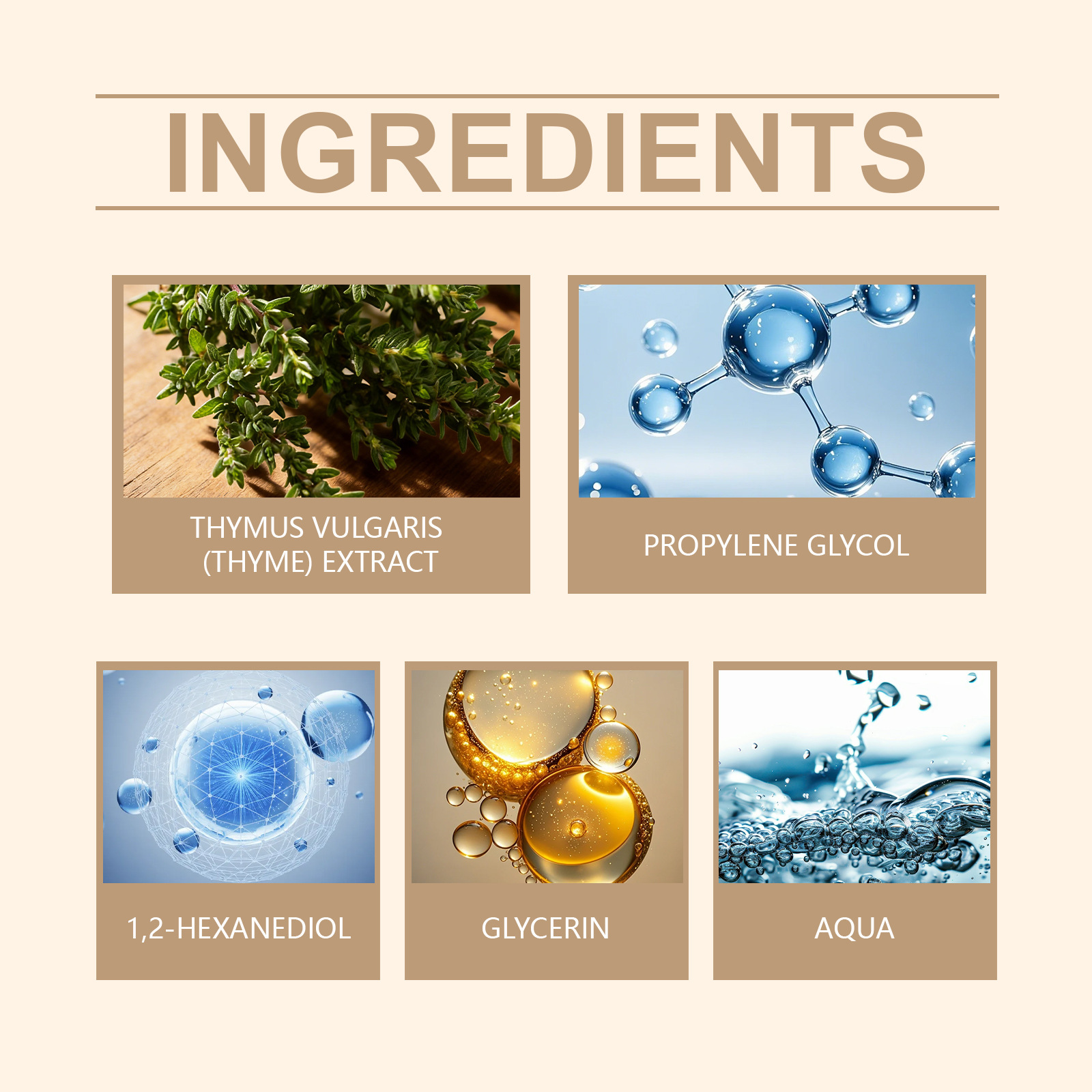 Ingredients: water, propylene glycol, glycerin, 1,2- hexanediol, thyme extract.